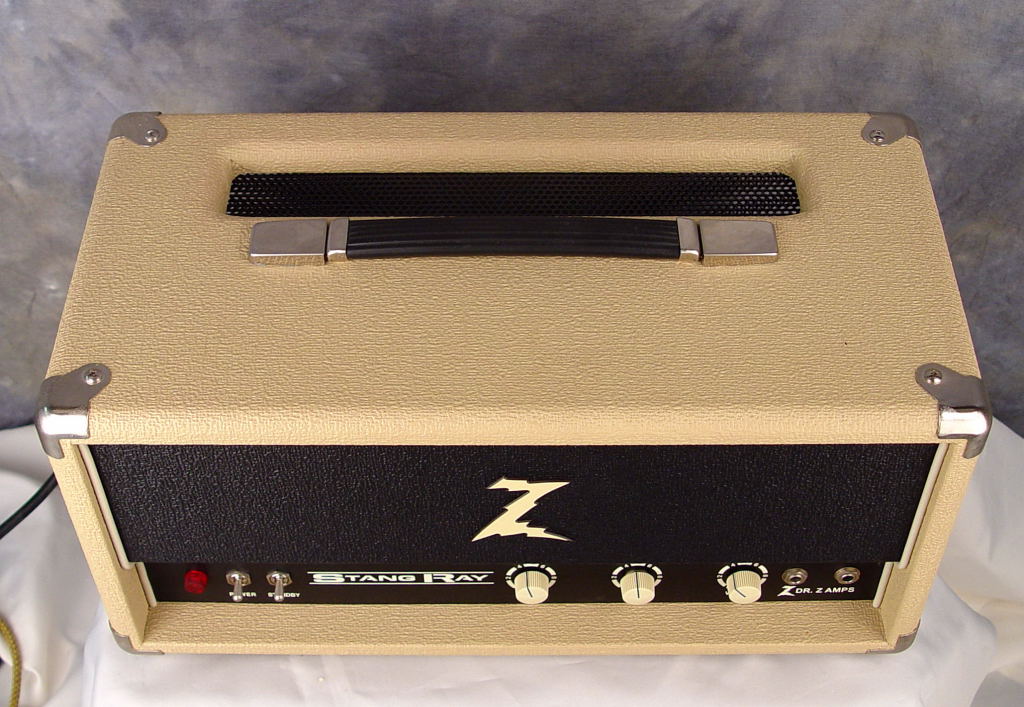 The Stang Ray was simply the re-naming of the "Stingray" shown in combo form above. The Stang Ray is the result of his second collaboration with superstar country guitarist Brad Paisley. They wanted to develop an amplifier that offered an additional palate of tones to work alongside the Prescription RX, their first collaboration. Using the classic setup of a quartet of EL84’s biased close to true Class A at 30 watts, the new Stang Ray tips its hat to classic British tones, but like all Dr.Z amps, has its own unique voice. The output transformer was designed by Ken Fischer (Trainwreck). The Stang Ray also includes a convenient half-power switch to allow saturation of the output section for a different feel.
