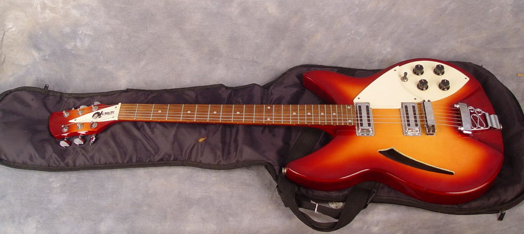 This is a "Series 10" branded Chinese-made replica of a Rickenbacker 330, listed here for comparison purposes only. Gig bag.