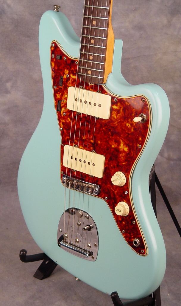 Here’s the story. I acquired this guitar in its original state except the body had been badly refinished. I was delighted to find that the refin did not extend to the body cavity, and the letters “DAFF” were written in pencil in the space between the pickups. I also discovered that the words “Daphne Blue” were written on a piece of masking tape holding the pickup wires to the metal pickguard shield. I had the body refinished to match the original Daphne Blue paint in the body cavity, of course preserving the original paint where found. All original except for body refin, this is a classy guitar, plays great and is a piece of Fender history. Brown OHSC with orange plush lining.