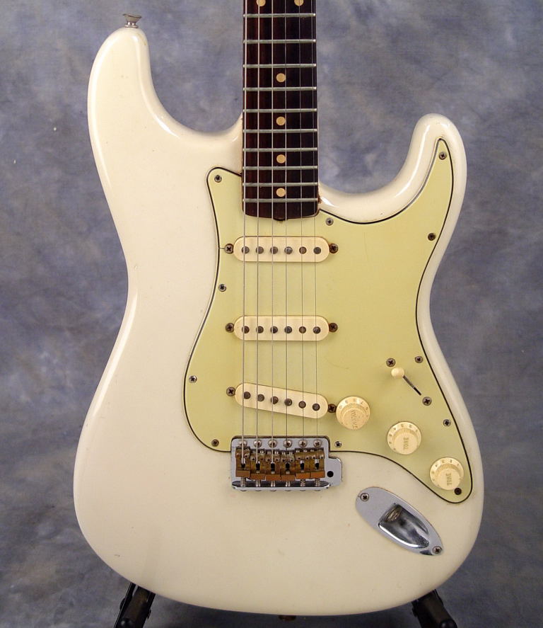 With original “mint green” guard; old '70s refinish and refret by renowned New Jersey luthier Philip Petillo with shop sticker in neck pocket; brass bridge saddles; black Fender mid-60’s HSC with orange/red lining.