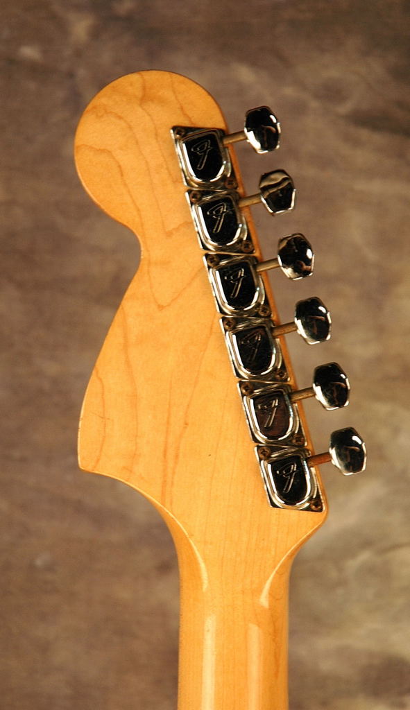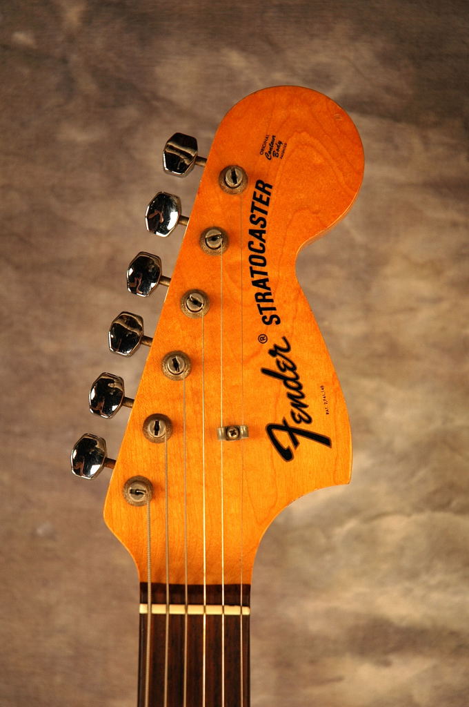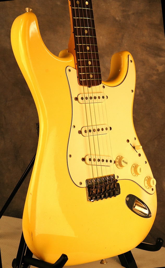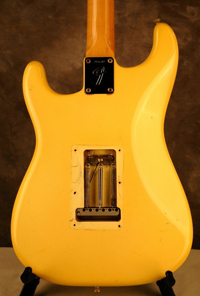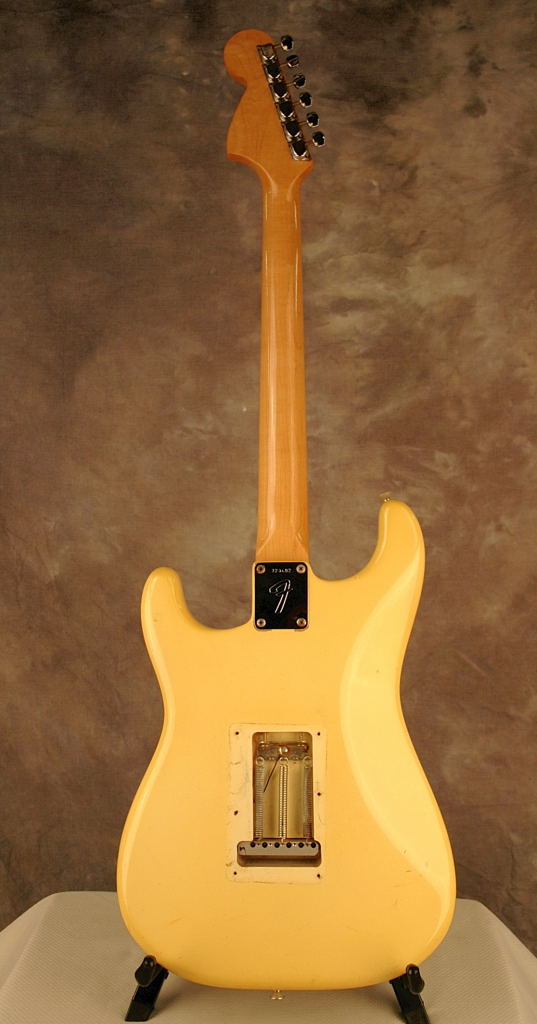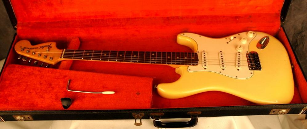Fender Stratocaster in Olympic White, the last of the 4-bolt Strats. This example has a white pickguard and the body finish has slightly yellowed over the years. OHSC