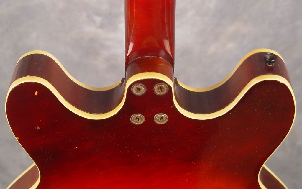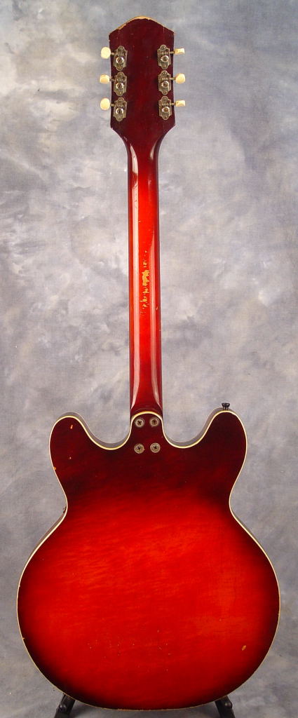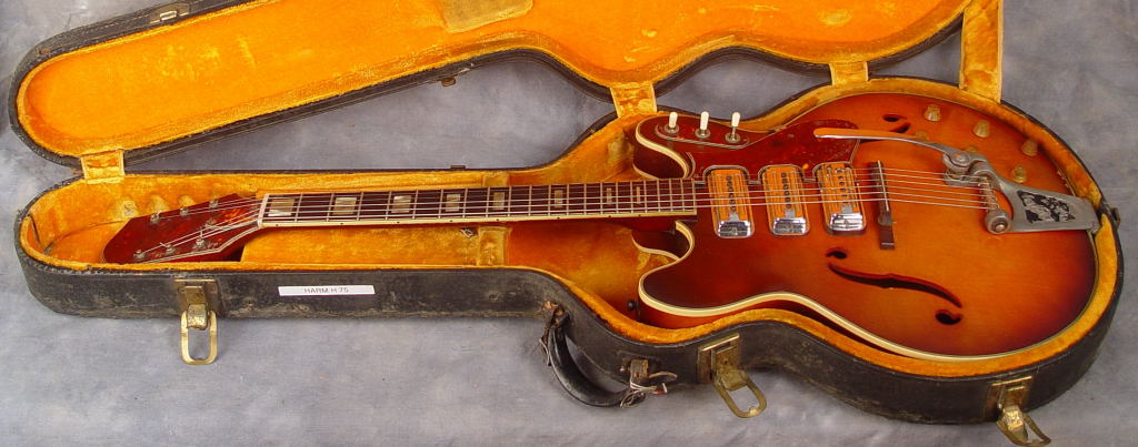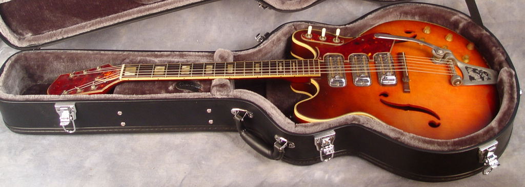 This guitar was the top-of-the-line Harmony brand in the mid-1960s, sporting three pickups and separate V/T controls for each, three pickup selector switches, tortoise shell headstock veneer and pickguard, and a Bigsby vibrato. HSC
