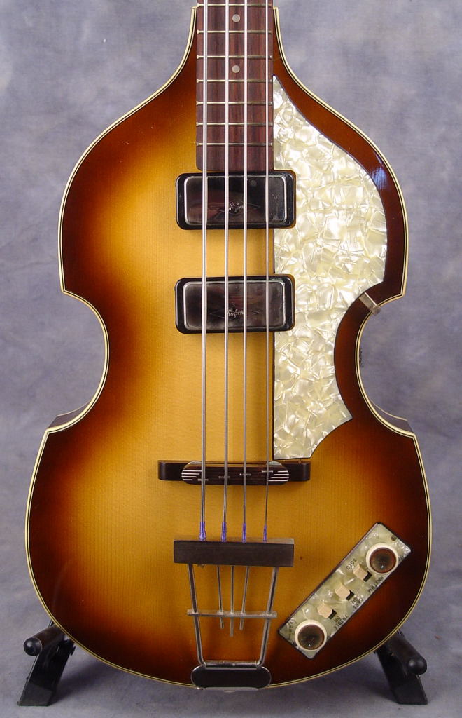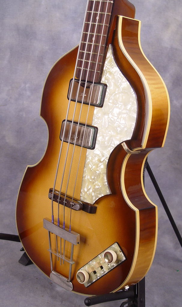 This is a replica of Paul McCartney's first Hofner bass, having two pickups close to the neck position. It is called the "Cavern Bass" because it was this model that he played in the early days in the Cavern in Liverpool. One of six made for the US market, this specific reissue is somewhat rare and was purchased new. With hang tag, paperwork and OHSC.