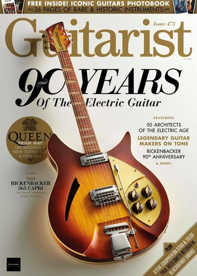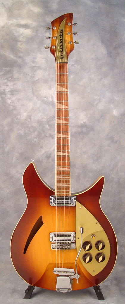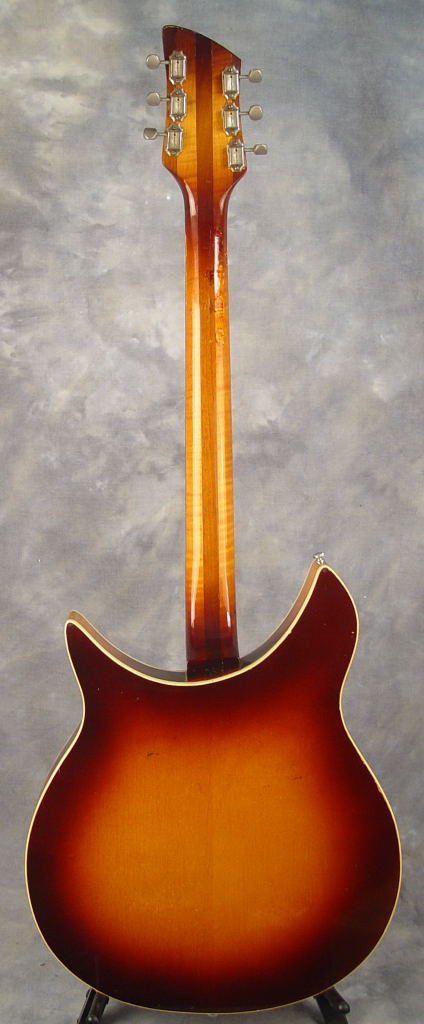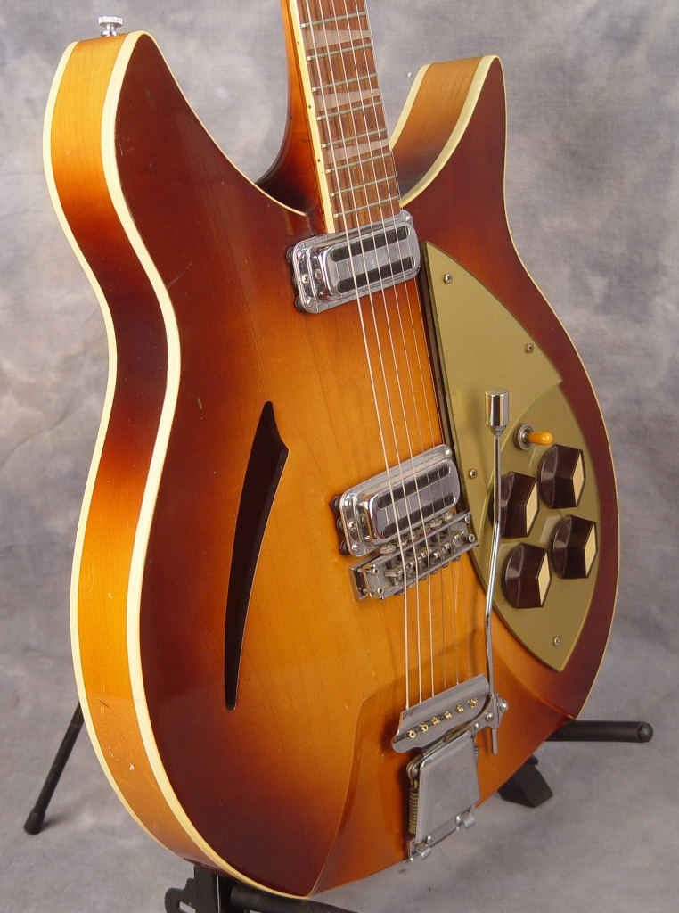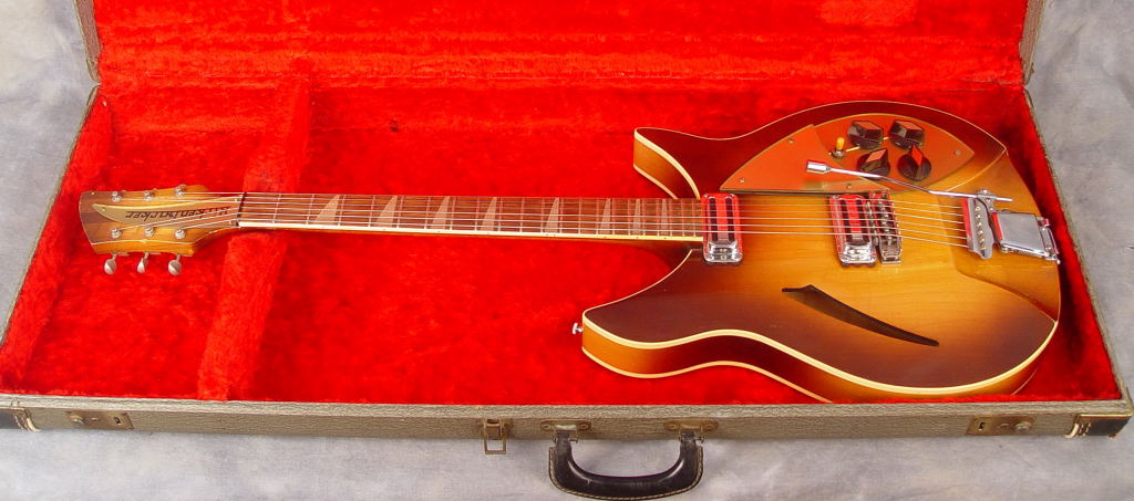 This guitar, having two toaster-top pickups and a Kauffman vibrola unit, was produced in early 1959 in the rare finish color of Autumnglo, By mid-1959, the predominant finish color for Capri model was Fireglo. This particular guitar was featured on the cover of the July 2021 issue of Guitarist Magazine, commemorating the 90th anniversary of the Rickenbacker brand (photo). With OHSC