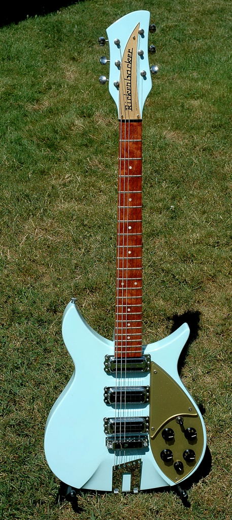 Rickenbacker model 350V63 refinished in Blue Boy with gold lucite pickguards and truss rod cover. OHSC
