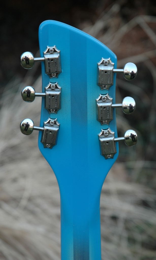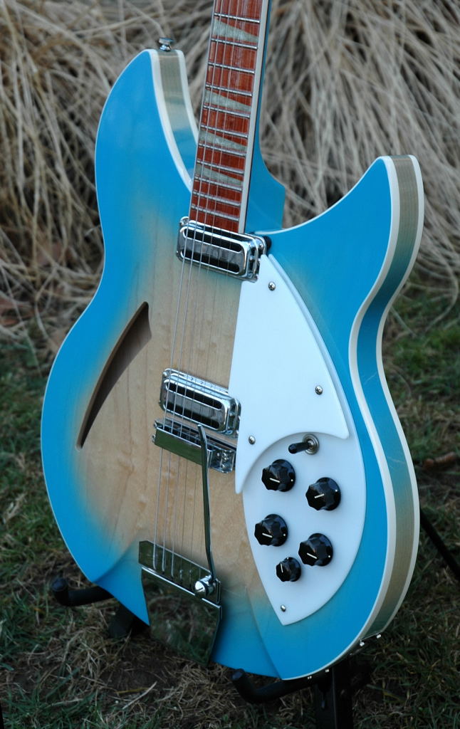 Rickenbacker model 360V64 originally Mapleglo, has been given a shade coat of light blue, in an attempt to mimic the notorious one-off 365 OS in the 1967 RIC factory shade of that color scheme, as shown in the last photo. OHSC