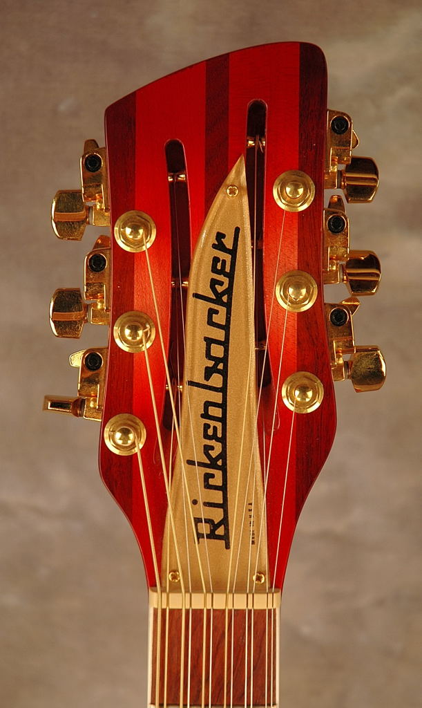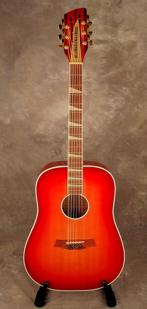 This Dreadnought bodied guitar with maple back and sides and Sitka spruce top is known as the 'Laramie' model in Rickenbacker parlance. This was one of the last acoustic guitars issued by the RIC factory before it ceased making acoustic guitars in early 2006. This guitar features checkered body binding and sound hole and full width fretboard inlays with no pickguard. Note also the flamed maple tiger-stripe back. OHSC